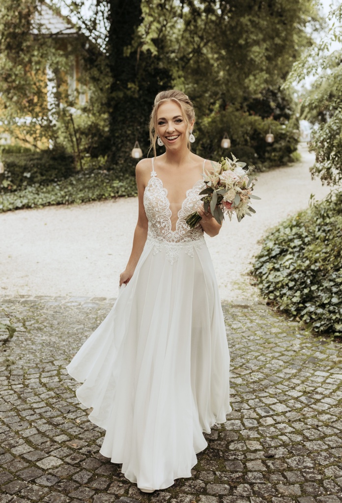 I know that many of you will keep your wedding dress as a reminder of your big day, so I'll give you another tip. I recommend having the wedding dress professionally cleaned before storing it. The wedding dress can then be stored in the dress cover, which I provide with the wedding dress. And another important point: store the wedding dress horizontally, if possible, to avoid stretching of the fabric.