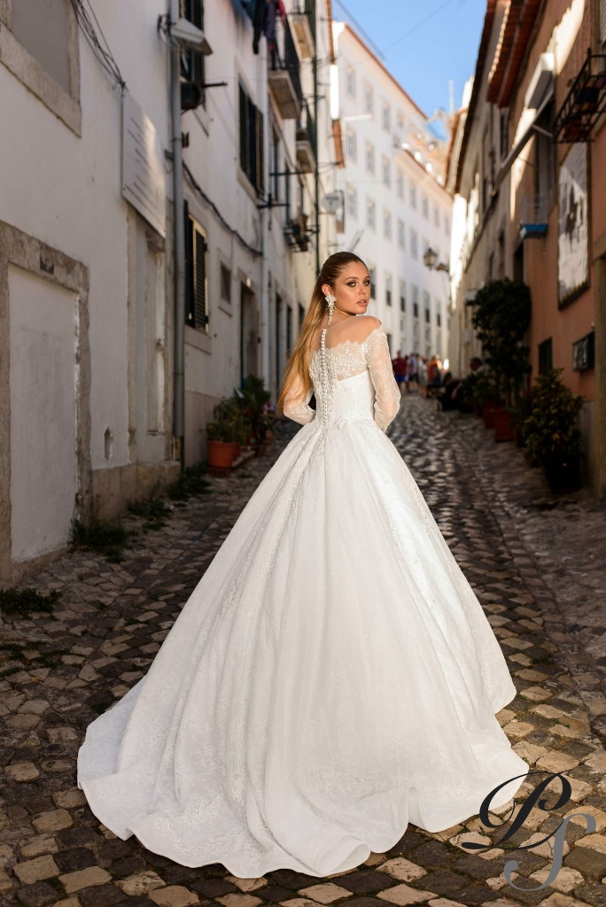 Off-shoulder princess-silhouette ivory wedding dress. The corset is made of natural lining and high quality satin, which is covered with delicate French lace. It is decorated with embroidered from beads, pearls and sequins guipure also falling onto the skirt from the waist. Cups are sewn into the front bodice (push-up). The dress is fastened on the back with satin lacing, hidden under pearl buttons and a secret zipper on the skirt. The skirt consists of natural lining and royal satin, which are hidden under 5 layers of soft tulle and covered with a delicate French lace structure. The bottom contour of the skirt is complemented by a seal for greater wavy effect.