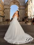 Spaghetti-strap princess-silhouette ivory wedding dress. Great attention is paid to the model by a layer of the designer rose net with silver coating in the honey-comb pattern, creating a special feature both on the bodice and on the skirt under a layer of soft tulle. The transparent bodice is made of two layers of stretch soft tulle with strong seams and cups sewn on the front (push-up). Another feature of the dress model is the drapery, made around the circumference of the bodice. The straps that rest on the shoulders are embroidered on top with shiny beads. Embroidery is also present on the belt between the bodice and the skirt. The dress is fastened on the back with a hidden zipper. The skirt is made of natural lining, royal satin and several layers of soft tulle, which all together continue in a small train.