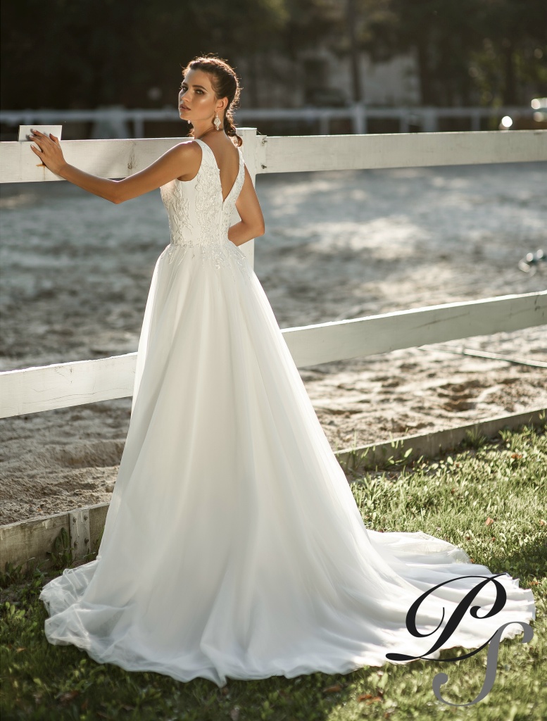 Simple A-silhouette ivory wedding dress with V-neck. The corset in the form of a shirt is made of natural lining and high-quality satin and is decorated with embroidered lace with elements of crystals, beads and sequins. There are also sewn cups in the front corset (push-up). The bodice is fastened at the back with a hidden zipper. The skirt consists of natural lining and royal satin, which are hidden under 5 layers of soft tulle. There is also a 50 cm long train.