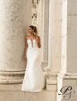 Strapless siren-silhouette ivory wedding dress in Clean Chic style. Sewn from royal satin with natural lining underneath. The unusual corset with a stylish cut will not be ignored. It has a deep V-neckline in the front to the very waist and a tulle insert in the neckline. An open neckline and an open back emphasize tender shoulders of the bride. It is fastened with lacing from natural lining and a secret zipper. In addition to everything, there will be a neat train from the skirt.