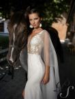 Siren-silhouette ivory wedding dress with deep V-cut in front and on the back. The transparent bodice is made of two layers of stretch soft tulle with durable seams and decorated with solid lace that is embroidered with beads and sequins. The deep neckline in the front is trimmed with beads around the edges. There are also sewn cups in the front corset (push-up). The dress is fastened behind with the secret zipper. Great attention is paid to decorative detachable tulle sleeves that wavy fall to the floor. The skirt is made of natural lining and stretch royal satin, which is covered with French Chantilly. There is a cut in the front of the skirt, giving more freedom of movement and underlines femininity.