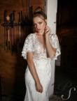 Straight silhouette ivory wedding dress. This is a single-piece macrame dress made from natural yarns. The 2 layers of soft tulle with strong seams create strengthening effect for a transparent corset. There are sewn cups in the front corset (push-up). The dress is fastened with a secret zipper on the skirt. Most of attention falls on designer flare sleeves, which smoothly turn into a cape from the back. The skirt is made of natural lining and royal satin, covered with macrame. The skirt continues in a 50 cm long train. Also there is a removable necklace on the back, made by hand with shiny crystal threads.