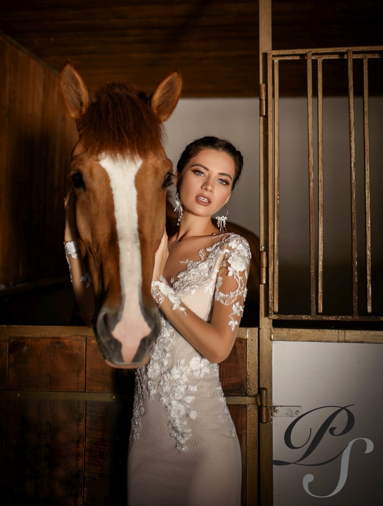 Siren-silhouette nude weeding dress. The dress is completely covered with tulle with a large ivory-colored mesh. The bodice is made of natural lining and high-quality satin with durable soft tulle sewn from neckline to back. Tulle sleeves decorated with appliqués and pearl buttons on the wrist are also sewn. The dress is decorated with guipure, embroidered with pearls and sequins, at the top and along the entire skirt edge. The deep V- shaped cut behind is sheathed in shiny beads on the edge. The skirt is made of natural lining and royal satin, which emphasize the silhouette and slims the bride.