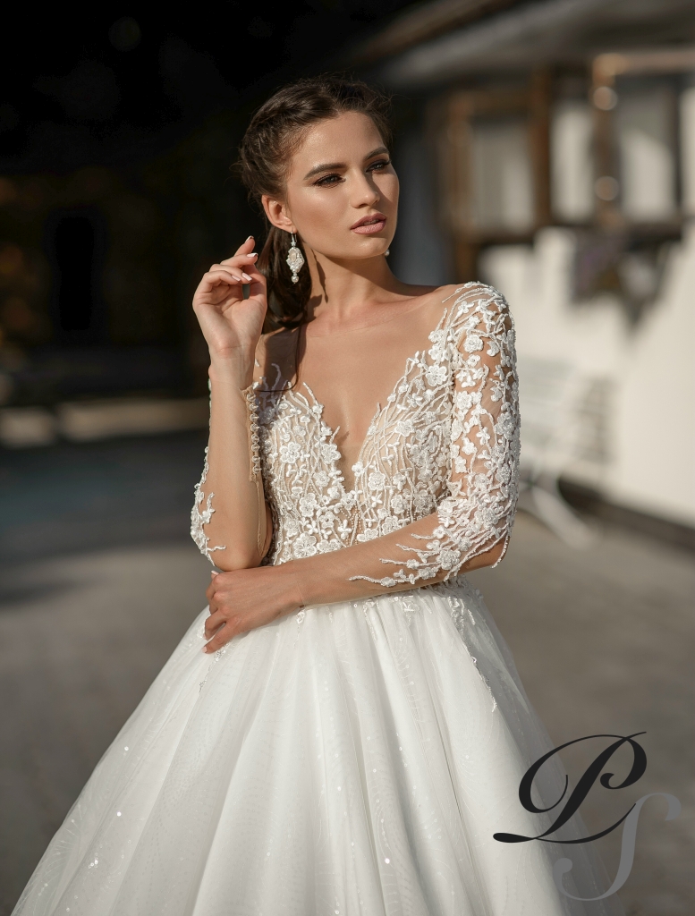 Princess-silhouette ivory wedding dress. The transparent bodice is made of two layers of stretch soft tulle with strong seams, in front of which there are sewn cups (push-up). The corset with a deep neckline is decorated with embroidered guipure made of beads, pearls and sequins, which slightly transits from the waist to the skirt. The dress is fastened from the skirt with a secret zipper and in the waist with the help of hidden lacing, which is covered with crystal buttons sewn on a corset. The sleeves are fastened in the base of the wrist. The skirt is made of natural lining and royal satin, which are hidden under 6 layers of soft tulle and a layer of shiny tulle with foil print, over which there is a canvas of embroidered French guipure. A seal is sewn on the bottom of the skirt which gives wavy effect.