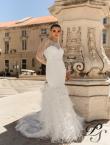 Fascinating ivory wedding dress in siren-silhouette. The exquisite bride gown is made of natural lining and royal satin and fully decorated with French Chantilly from which sleeves with buttons are also made. There are cups in the front corset (push up). The dress is fastened on the back with a secret zipper. The lower part of the skirt is made of delicate lace with densely but unnoticeably sewn feathers. The thin designer belt, embroidered with pearls and SWAROVSKI stones, covers the seam between the bodice and the skirt.