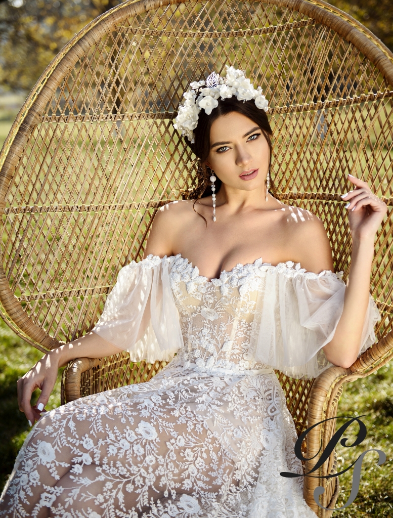 Transparent strapless A-silhouette ivory dress in boho style. The dress is completely covered with guipure on the corset and skirt. The off-shoulders corset is made of two layers of stretch soft tulle with strong seams. Removable sleeves in the form wings, decorated with appliques at the neckline, cling to the shoulders. There are sewn cups in the front corset (push-up). It fastens at the back with a hidden zipper and lacing. The short skirt is made of natural lining and royal satin. There is also a 50 cm long train.